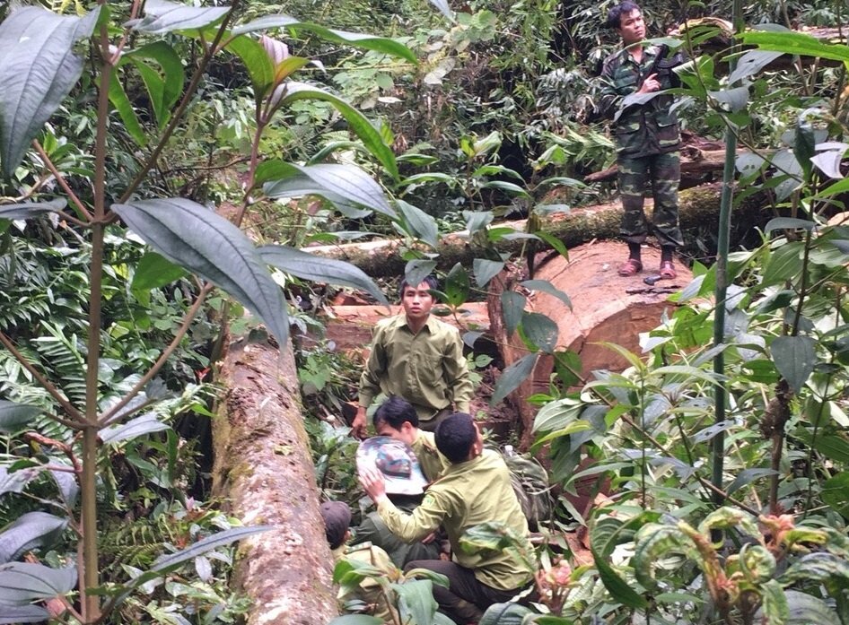 Tại hiện trường các đối tượng đang chặt phá có 1 cây samu, đường kính 1,7m đã bị đốn hạ và đang trong quá trình xẻ ván để vận chuyển ra khỏi rừng. Được biết, với đường kính 1,7m cây samu này đã có hàng trăm năm tuổi.