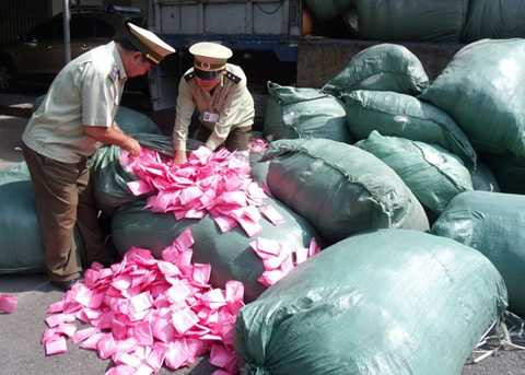 | Lực lượng Quản lý thị trường tịch thu trên 2 tấn băng vệ sinh không nguồn gốc. |
