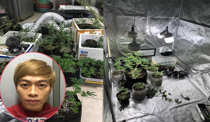 Khi lên tầng 4, tầng 5, lực lượng công an phát hiện nhiều cây cần sa đang được trồng trong bầu đất cùng cành, lá khô của cây cần sa được đựng trong túi nilon màu đen.