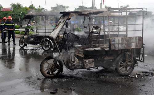 Sau đó, chủ quán hải sản này hô nhân viên: "Đốt xe chúng nó đi!", lập tức một nam nhân viên chạy ra ngoài, lấy xăng tưới lên chiếc xe ba gác để đốt. Cùng thời điểm 3 chiếc khác cũng bị đốt, hiện tại cảnh sát chưa xác định được thủ phạm.