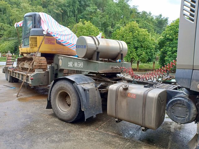 Chiếc xe đầu kéo chở theo chiếc máy xúc cất giấu gần 200 bánh heroin. (Ảnh: CTV)