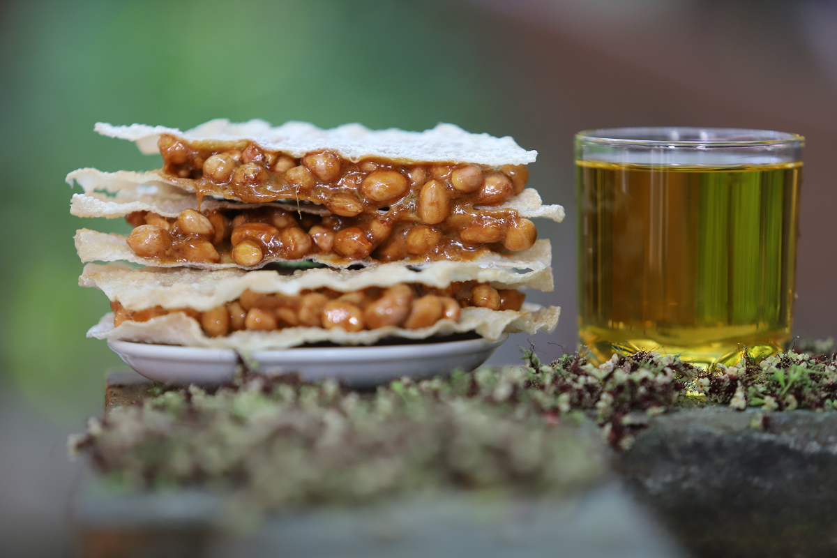 Lạc rang giòn nấu với mật mía và thêm chút gừng tươi thái sợi vào khuấy đều. Một thứ kẹo ngẫu hứng nhưng lại được khách khứa vô cùng ủng hộ và tấm tắc khen ngon.
