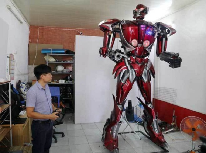 Các công đoạn thực hiện lắp ráp cơ học cũng khá cầu kỳ, tỉ mỉ. Sau khi hàn xong “khung xương” cơ bản của robot bằng sắt, từng mảnh vật liệu phù hợp sẽ được lắp ghép lên khung này.