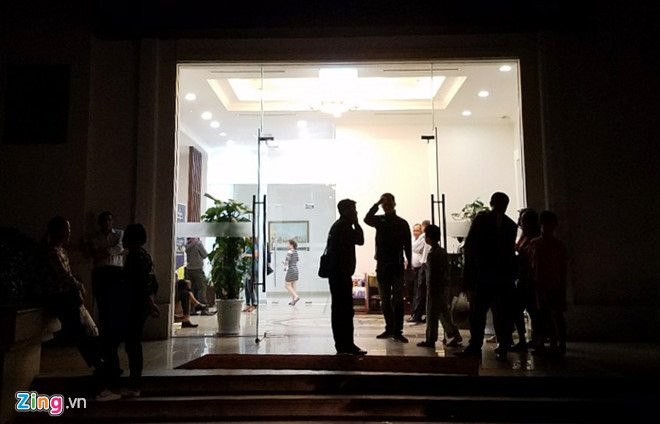 Nhiều người tập trung bên ngoài sảnh R4B chung cư tối 31/10. Bảo vệ tòa nhà không cho người lạ vào trong. (Ảnh: P.V)