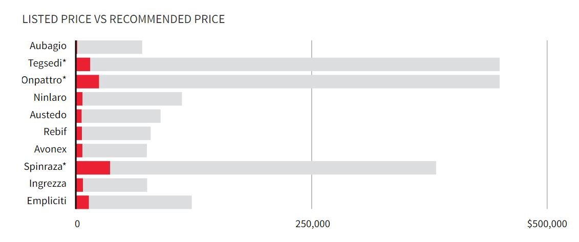 Giá một số loại thuốc. Màu xám: Giá được liệt kê; màu đỏ: giá khuyến nghị. (Đơn vị: USD)