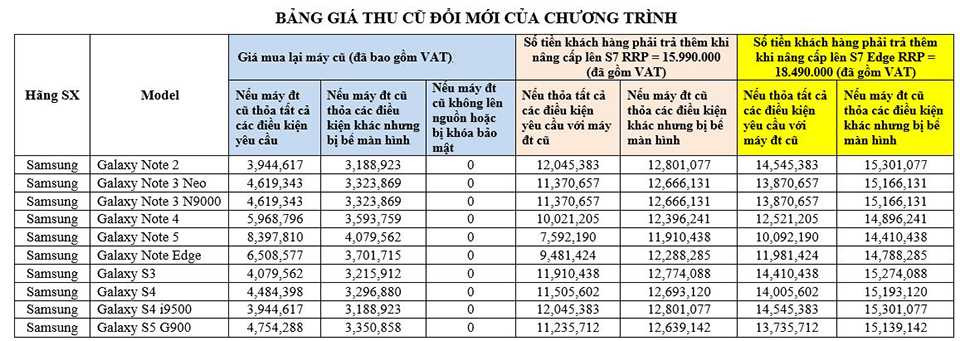 Cụ thể, từ 1/10 đến hết 30/10, những khách hàng có smartphone Samsung hay iPhone cũ nằm trong danh sách công bố sẽ được FPT Shop mua lại với mức giá định sẵn, sau đó khách bù thêm một số tiền nhất định để sở hữu hai chiếc máy cao cấp nhất dòng S hiện nay của Samsung.