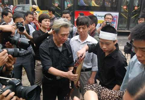 | Con trai chị Huyền (mang khăn trắng) cùng ông ngoại đến dự phiên xử. |