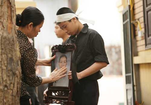 | Con trai nạn nhân Huyền mang di ảnh của Mẹ đến phòng xử án. Ảnh Nguyễn Dũng |