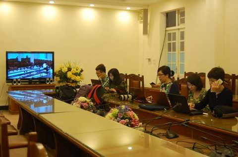 Bên trong, các phóng viên được bố trí tác nghiệp tại phòng riêng, theo dõi diễn biến phiên tòa qua màn hình tivi.