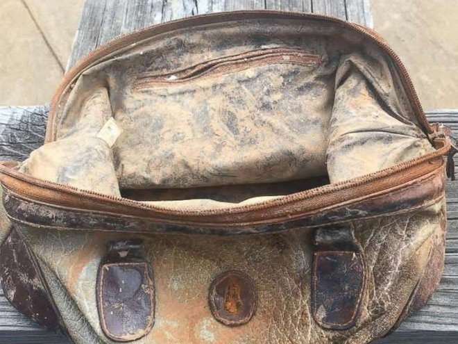 Chiếc túi cũng đã cũ nát, bám đầy bùn đất sau 25 năm ngâm mình dưới nước