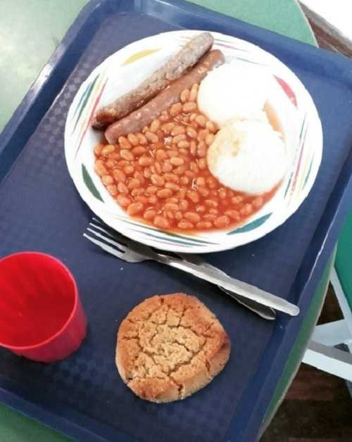 Mỹ: Một bữa trưa phục vụ cho học sinh ở Nottingham có xúc xích, khoai tây nghiền, đậu nướng sốt cà chua và một chiếc bánh.