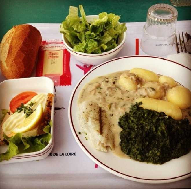 Pháp: Một bữa trưa đầy đủ dinh dưỡng của học sinh ở Pays de la Loire có cá, rau chân vịt, khoai tây, xà lách, pho mát và bánh mì.