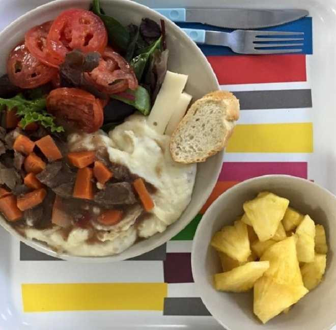 Mỹ: Một bữa trưa cho học sinh ở trường học Pháp tại Mỹ có bò hầm rượu vang đỏ, salad và dứa tươi.
