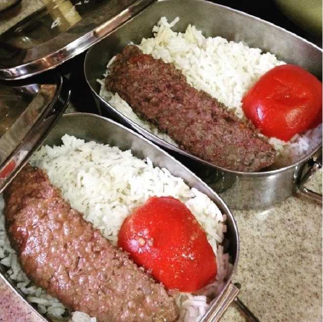 Iran: Đây là bữa trưa được chuẩn bị từ nhà mang tới trường. Trong hộp có cơm, cà chua và thịt cừu nướng.
