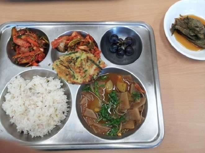 Hàn Quốc: Bữa trưa của học sinh Hàn Quốc có cơm, súp, kim chi, bánh kếp hành hải sản và nho để tráng miệng. Đĩa nhỏ ở bên cạnh là lá vừng muối chua, một món ăn kèm phổ biến.