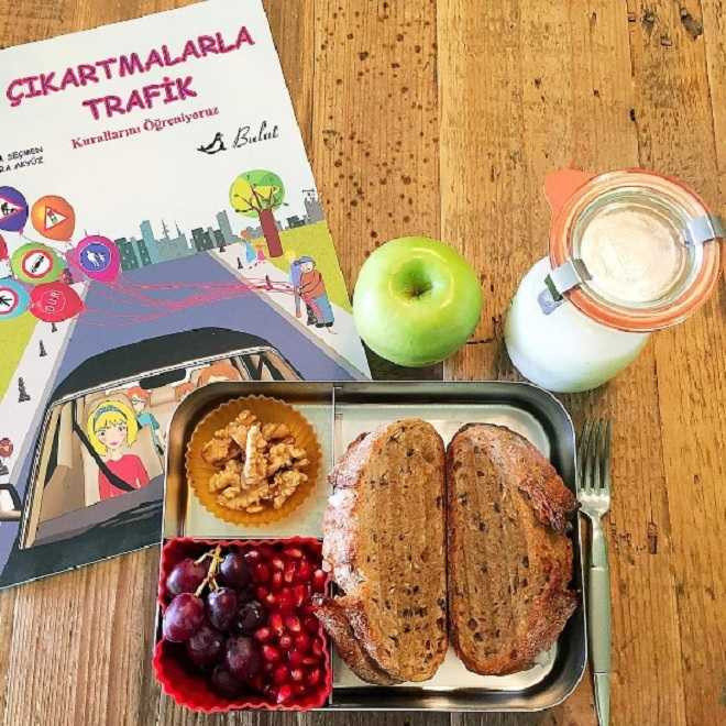Thổ Nhĩ Kỳ: Đây là bữa trưa chuẩn bị từ nhà của một học sinh, gồm có bánh mì lúa mạch đen, quả óc chó, hoa quả và nấm sữa kefir.