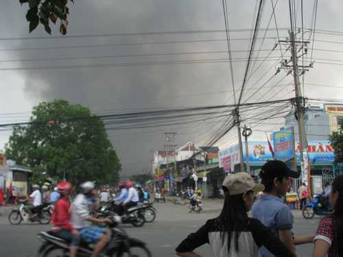 | Công ty Giày da Thông Dụng bị đốt cháy khói mù mịt. Ảnh: NLĐ |