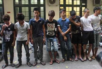 | Nhóm 'quái xế' Hưng Yên bị bắt tại trụ sở công an. |