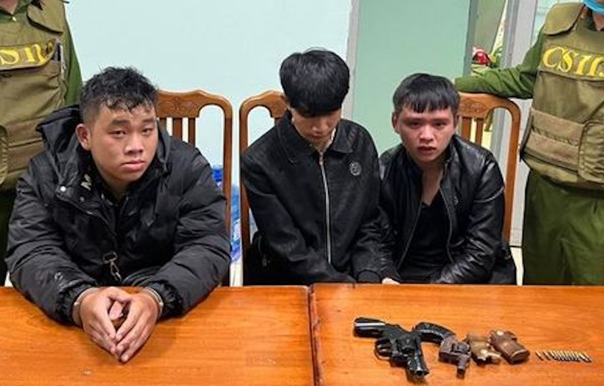 Tại hiện trường và trên người 3 thanh niên kể trên, lực lượng công an thu giữ 2 khẩu súng, 12 viên đạn chì chưa sử dụng và 9 vỏ đạn đã sử dụng cùng 2 chiếc xe máy BKS 81X1-093.39 nhãn hiệu Honda Sonic và 81M1-134.82 nhãn hiệu Suzuki Raider mà các đối tượng sử dụng để đi đánh nhau.