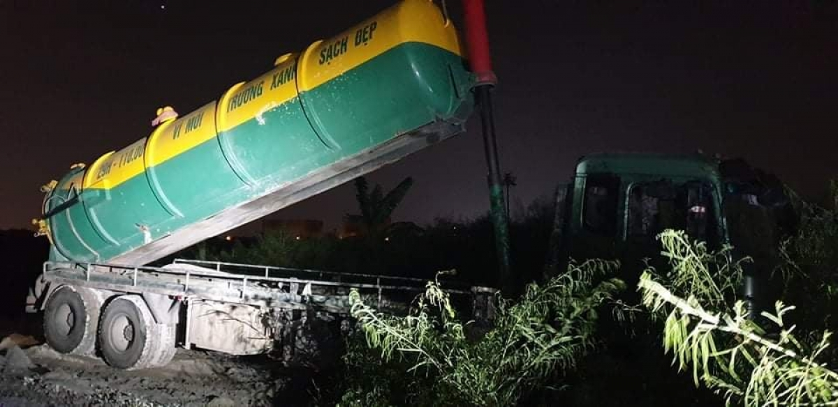 Cụ thể, vào khoảng 23h ngày 10/9, tổ trinh sát của Đội 2, Phòng Cảnh sát môi trường Công an TP Hà Nội mật phục, phát hiện xe bồn mang BKS 29H-110.00, trên bồn xe có dòng chữ "Vì môi trường xanh sạch đẹp" đang thực hiện hành vi đổ chất chất thải xuống bãi đất ven Đại lộ Thăng Long (thuộc địa bàn xã Song Phương, huyện Hoài Đức, TP Hà Nội).
