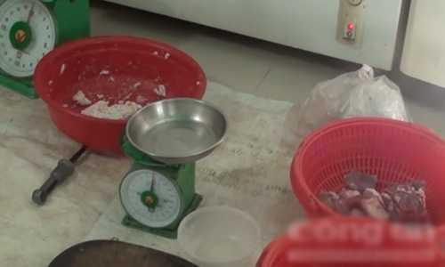 Cứ 1 kg thịt nạc thối và 0,5 kg mỡ, chủ cơ sở đem trộn với 1,5 muỗng chất Borax. Đây là cách mà một cơ sở trộn chất gây ung thư chế biến giò chả.