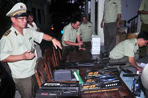 Số hàng cấm này gồm có 3 cây kiếm, 19 cây đèn pin điện, 35 cây ba trắc, 1 súng điện, 8 roi điện, 126 điện thoại và 8 thùng hàng linh kiện điện tử nặng trên 100kg.