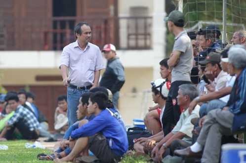 | HLV Guillaume nhắc nhở các học trò chiến thuật thi đấu trước giờ ra sân. Ảnh: S.H |