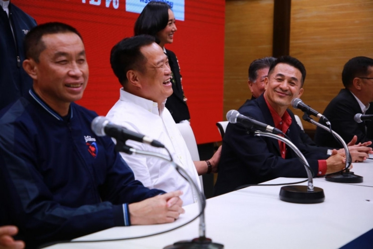 Lãnh đạo Đảng Vì nước Thái và Đảng Quốc gia Thái thống nhất gặp nhau ngày 22/7. (Ảnh: Somchai Poomlard)