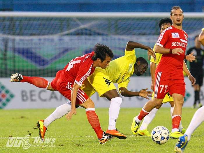 | B.Bình Dương (áo đỏ) dùng áo hàng chợ trong khi Hà Nội T&T (áo vàng) mặc đồ của Kappa (Ảnh: Quang Minh) |