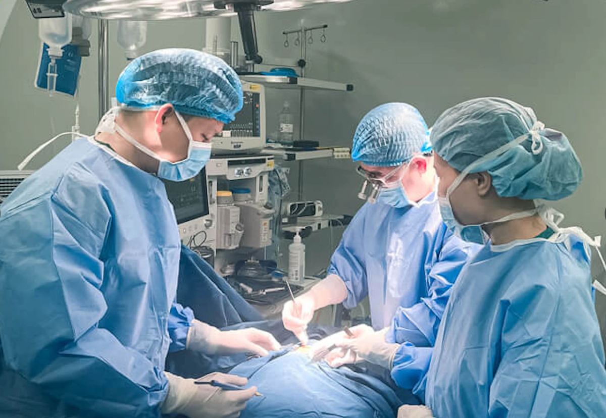 Các bác sĩ phẫu thuật nối ngón tay cho bé. (Ảnh: BVCC)