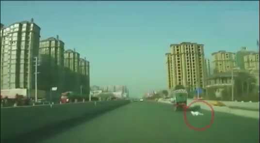 Đoạn video được quay trên đường phố ở tỉnh Hà Nam, Trung Quốc. Chiếc xe ba bánh của một gia đình đang chạy thì em bé bị rơi ra khỏi khoang chở hàng, tuy nhiên cha mẹ không hề hay biết.