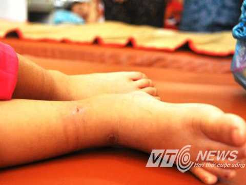 | Vết thương ở chân cháu Đỗ Thị Kim Ngân do bị cha mẹ ruột trói bắt quỳ dưới nền nhà cả giờ đồng hồ |