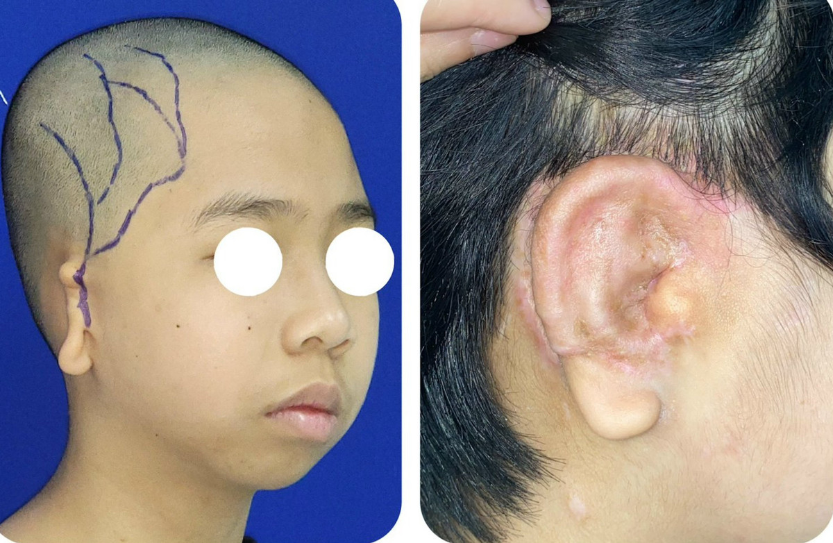 Các bác sĩ thực hiện kỹ thuật tạo hình tai nhỏ bằng sụn nhân tạo Medpor và ghép mỡ tự thân giàu tế bào gốc, điều trị những kiếm khuyết như của N.