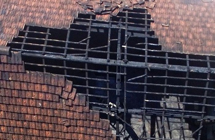 Căn nhà cấp bốn của gia đình anh Trường hư hỏng, mái ngói đổ ngổn ngang, toàn bộ tài sản bị thiêu rụi. Nhà chức trách đang điều tra nguyên nhân hỏa hoạn.