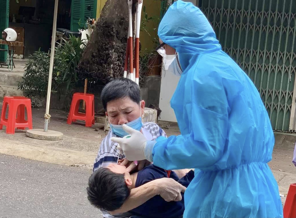 Lực lượng chức năng lấy mẫu xét nghiệm với các cư dân thuộc đường Nguyễn Đình Chiểu (TP Pleiku), chiều 3/2.
