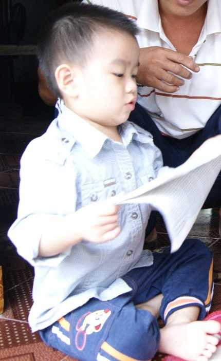 Anh trai của Phi học lớp 7 nên cu cậu thường xuyên đem sách của anh ra để … đọc cho vui. Điều đặc biệt, mới 3 tuổi, đang còn ngọng nghịu nhưng lại đọc khá nhanh và chính xác các câu chữ.
