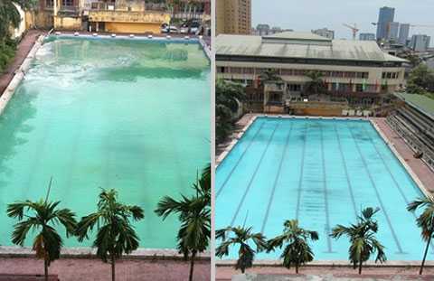 | Bể bơi Cầu Giấy trước và sau khi cho hóa chất. |