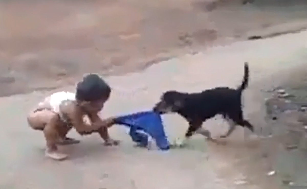 Bé con chật vật vì bị chó cưng cướp mất quần