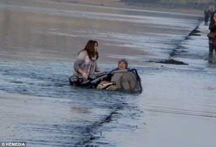 (VTC News) - Bà mẹ cùng với em bé trong xe đẩy của mình đã bất ngờ bị ngã khỏi đường nối ra đảo tại cửa sông và phải nhờ đến sự giúp đỡ của những người đi đường.