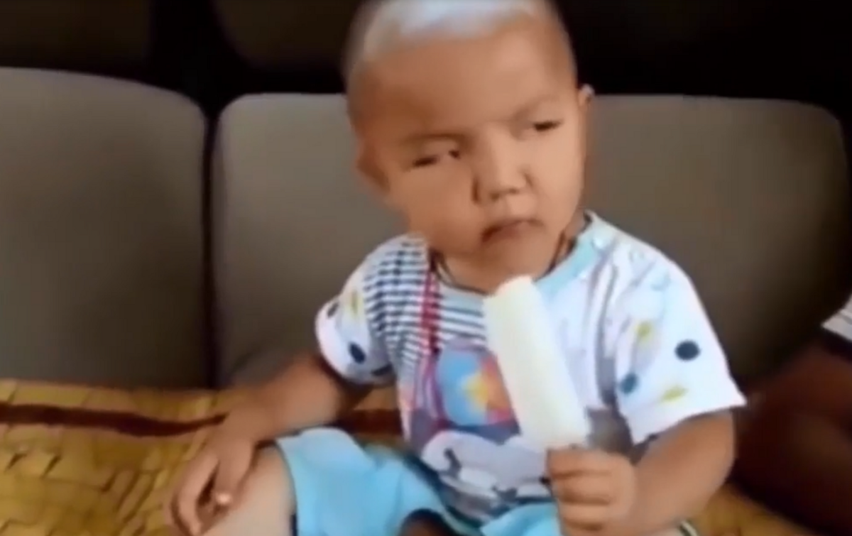 Vẻ mặt tức giận và ánh mắt lườm nguýt của cậu bé khi que kem của mình bị xâm phạm khiến người xem clip bật cười.