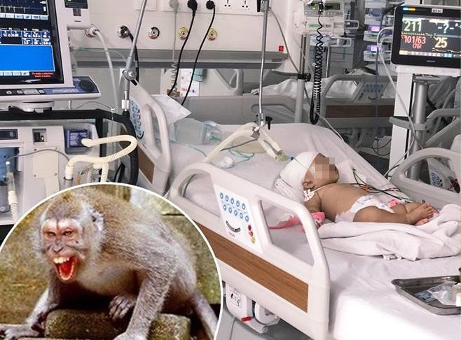 Bé K. bị khỉ tấn công gây ra vết thương rất nặng vùng đầu.