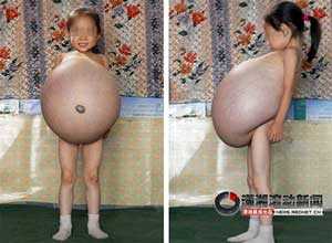 Chiếc bụng to quá cỡ so với cơ thể khiến bé Xiaoyun gặp rất nhiều bất tiện trong sinh hoạt hàng ngày. Cô  bé không thể đi ra ngoài vì cái bụng quá lớn và khá nhút nhát.