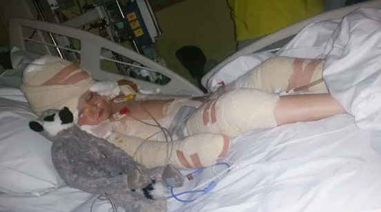 Hiện sức khỏe của bé phục hồi tốt, nhưng da đầu bị bỏng nặng nên tương lai tóc của em không thể mọc lại được.