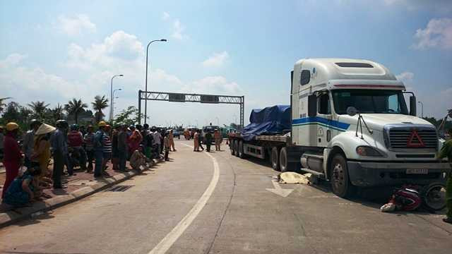 Lúc 8h sáng 4/6, trên đường dẫn từ đường cao tốc TP.HCM – Long Thành – Dầu Giây hướng ra đại lộ Mai Chí Thọ (phường Bình Trưng Tây, quận 2, TP HCM) xảy ra vụ tai nạn giao thông giữa xe đầu kéo container và xe máy.