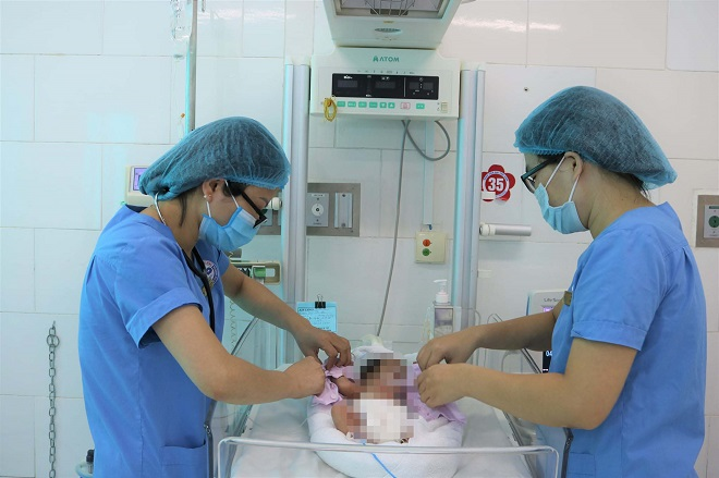 Bé được sơ cứu tại Trạm Y tế xã Đông Vinh, sau đó chuyển lên Bệnh viện Nhi Thái Bình. Tại đây, bệnh nhi được chẩn đoán suy hô hấp, nhiễm trùng sơ sinh, đẻ non, gãy xương đòn phải, rối loạn đông máu, rối loạn toan kiềm, bỏng độ 1 nửa người trái.
