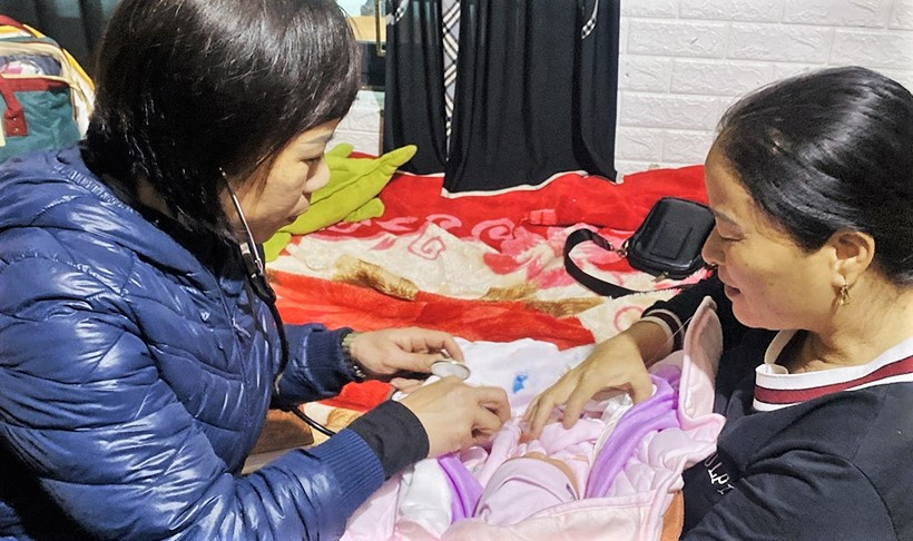 Cán bộ y tế kiểm tra sức khỏe cháu bé. (Ảnh: CTV)