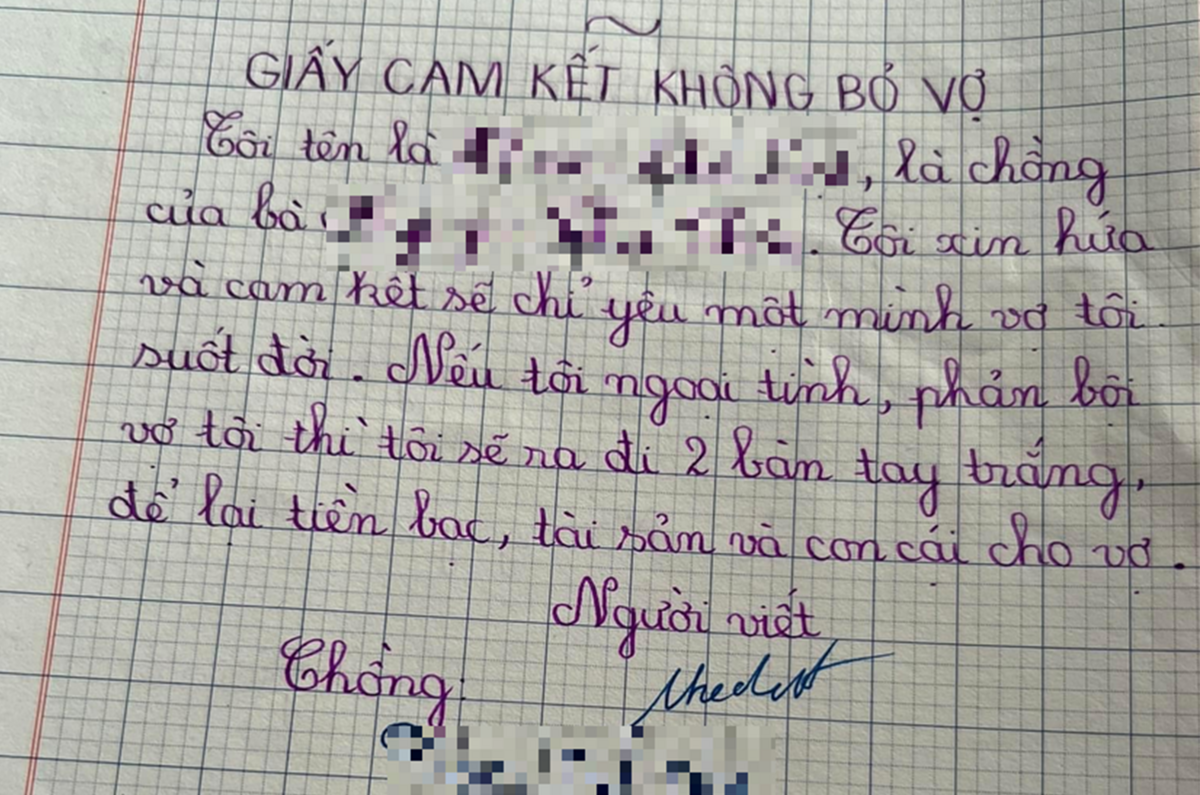 Nguyên văn nội dung của tờ đơn: “Tôi tên là P.T.Đ, là chồng của bà N.T.T. Tôi xin hứa và cam kết sẽ chỉ yêu một mình vợ tôi suốt đời. Nếu tôi ngoại tình, phản bội vợ tôi thì sẽ ra đi hai bàn tay trắng, để lại tiền bạc, tài sản và con cái cho vợ”.
