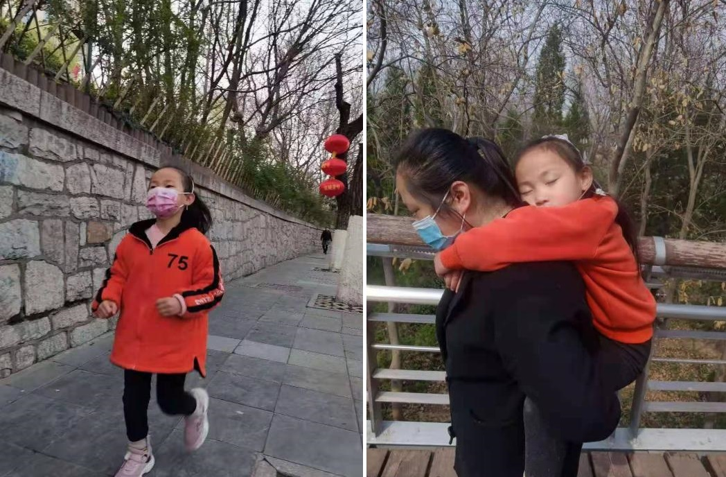 Qiqi chạy đến 10 cây số mỗi ngày và ngủ gục trên lưng mẹ khi trở về.