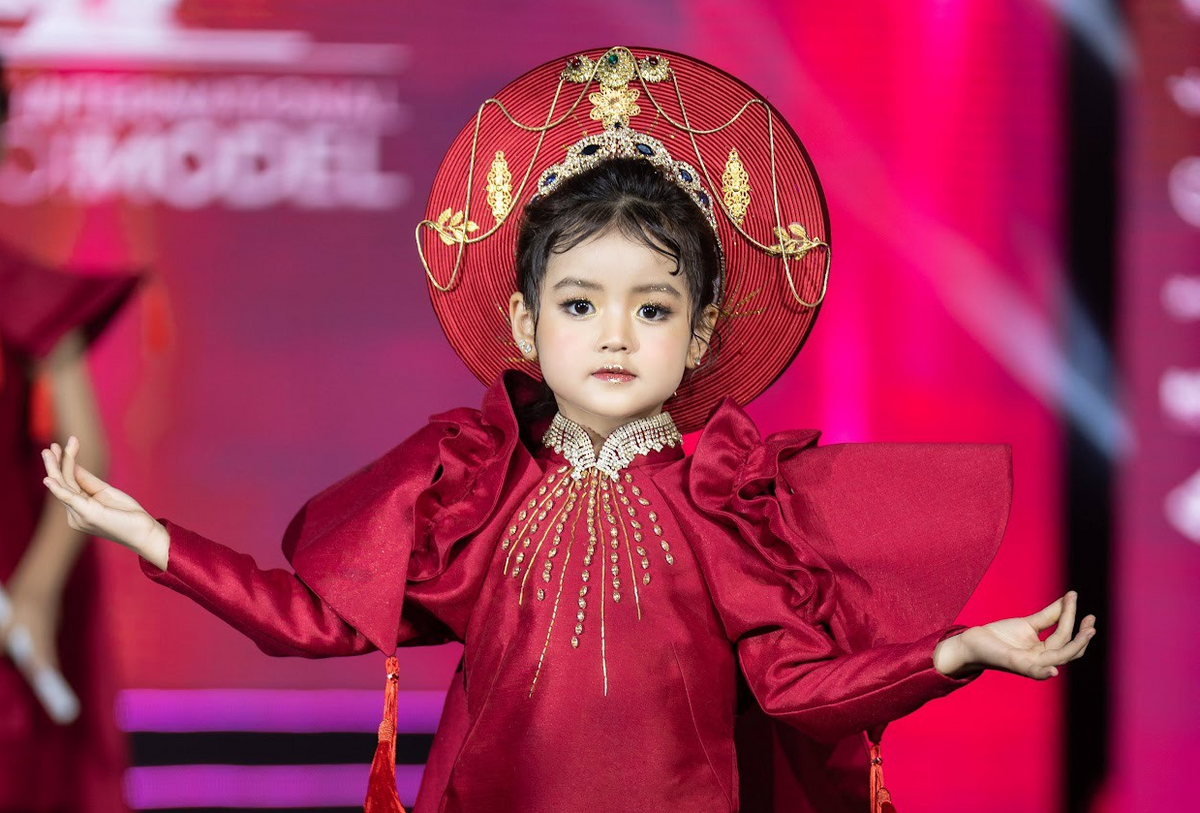 Cô bé diện chiếc áo dài đỏ cách diệu bước đi một cách điêu luyện trên sàn catwalk trước con mắt theo dõi của hàng trăm khán giả. Vốn là mẫu nhí chuyên nghiệp, bé An Nhiên không khó để thể hiện bản lĩnh và thu hút sự chú ý từ khán giả.