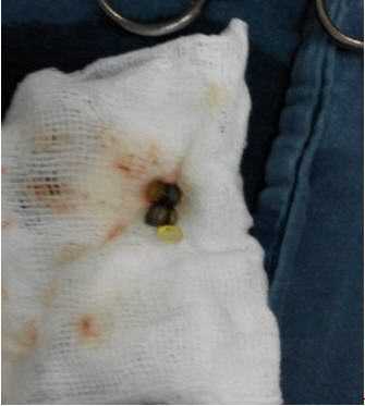 Kết quả tìm thấy có đoạn ruột giãn và đoạn ruột xẹp (ranh giới chỗ tắc ruột), tại ranh giới này thấy có dị vật hình trụ đường kính 0.5cm, dài 1 cm gây viêm hoại tử thành ruột lộ ra ngoài, dính với mạc treo tạo đọan gập góc gây tắc ruột.